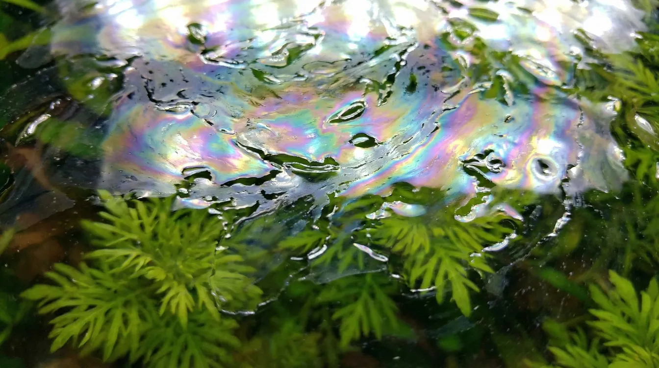 Oelig schimmernde Kahmhaut auf der Aquarium-Wasseroberfläche mit Regenbogen-Reflexen